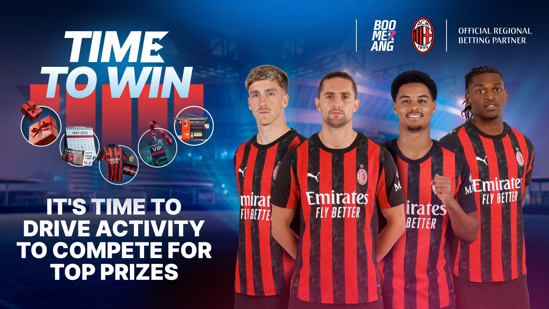 บูมเมอแรง พาร์ทเนอร์ส (Boomerang Partners) กำลังเดินหน้าแข่งขันทัวร์นาเมนต์ “Time to Win” ที่เปิดโอกาสให้ทีมพันธมิตรทั่วโลกเข้าร่วมชิงรางวัลหลากหลาย ทั้งของรางวัลและประสบการณ์สุดพิเศษที่ได้รับแรงบันดาลใจจากสโมสรฟุตบอลชื่อดังอย่าง AC Milan (เอซี มิลาน) จากประเทศอิตาลี โดยการแข่งขันนี้ผู้เข้าร่วมจะสะสมคะแนนจากการทำกิจกรรมด้านการตลาดและการสร้างการมีส่วนร่วมที่เกี่ยวข้องกับแบรนด์ในพอร์ตโฟลิโอของลูกค้าบูมเมอแรง
